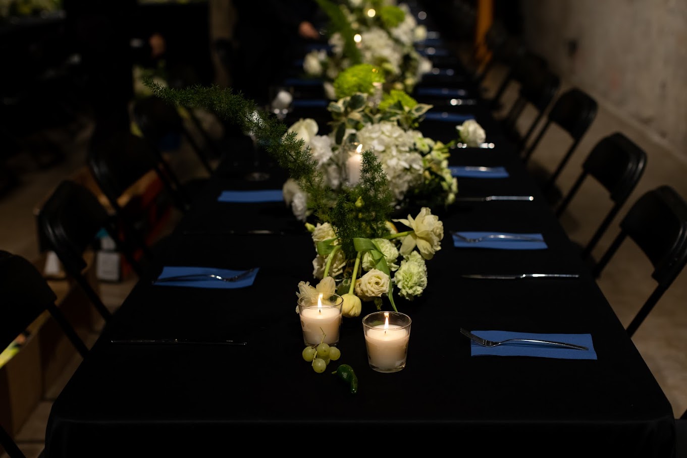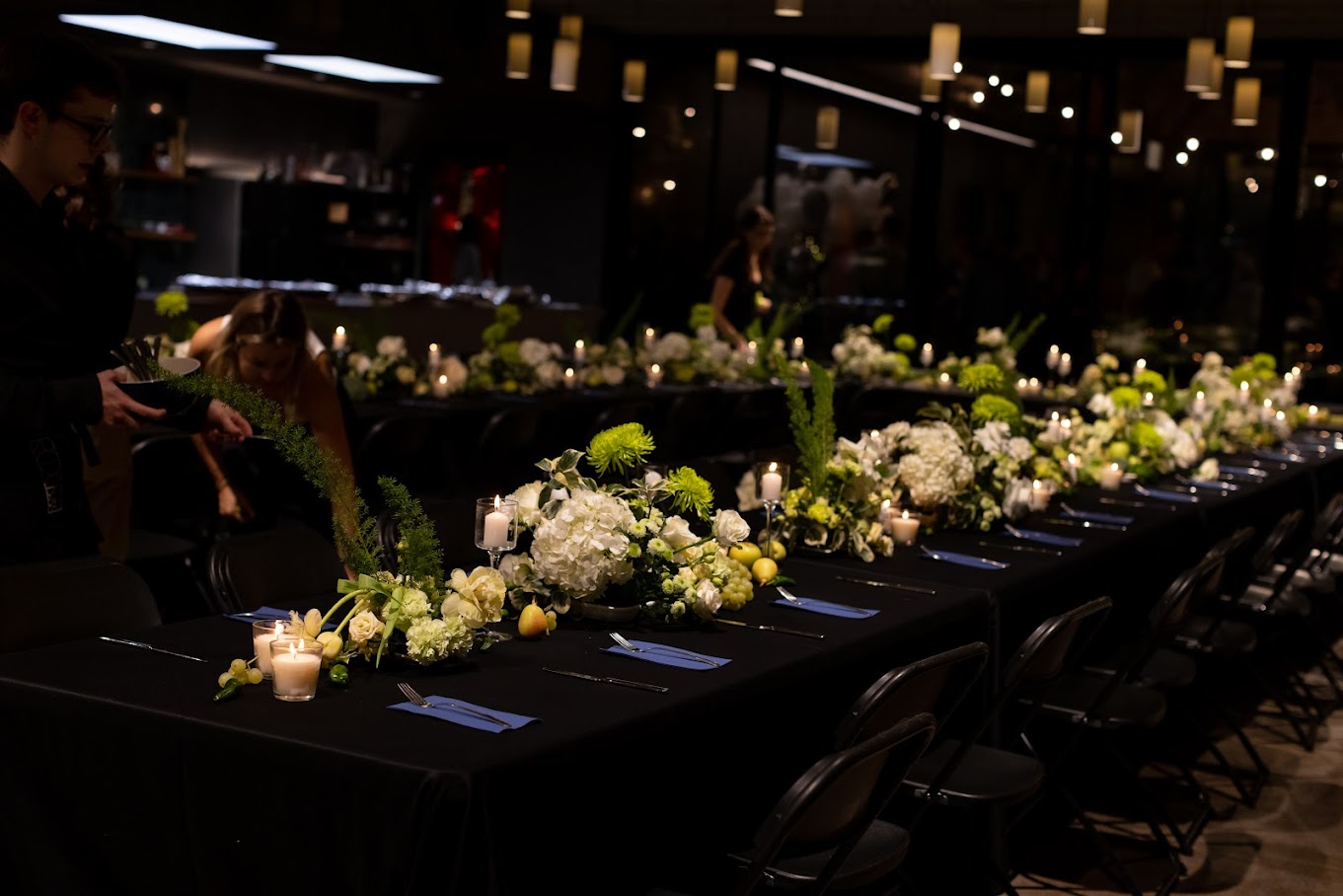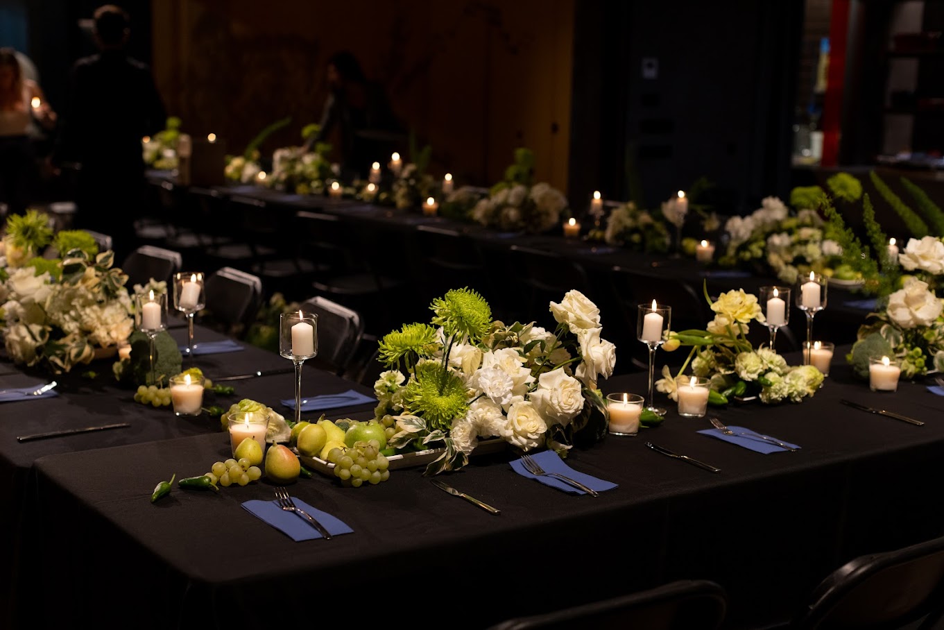 Decoración para cena empresarial en hotel – Blanco, verde y detalles frutales