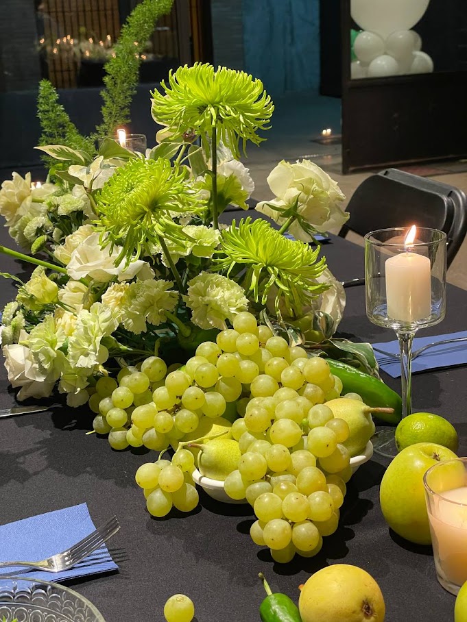 El blanco simboliza pureza y profesionalidad, mientras que el verde evoca equilibrio, naturaleza y calma. Los elementos frutales —limones, manzanas y uvas— aportan frescura y un guiño creativo, integrándose de manera armoniosa en la decoración floral para hoteles.